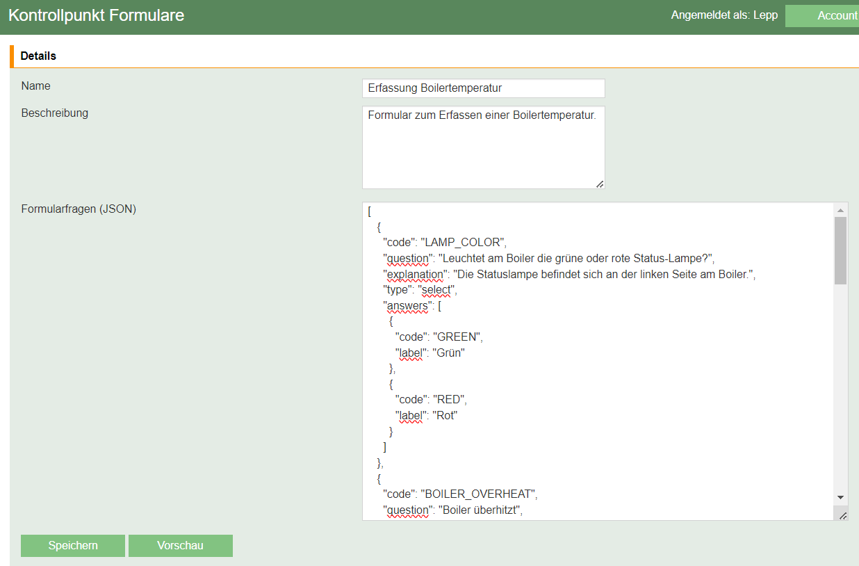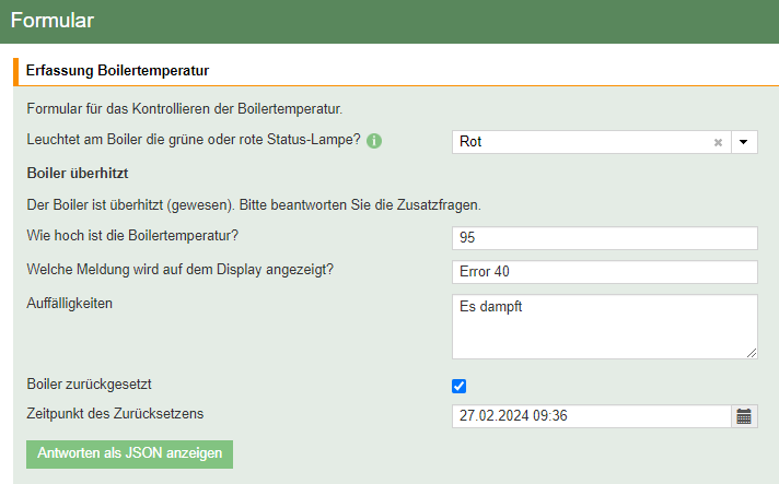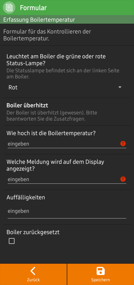 Nachfolgend finden Sie ein Beispielformular für das Erfassen einer Boilertemperatur. Dieses Formular können Sie bei Kontrollpunkten verknüpfen. Wenn der Benutzer in der SequriX App dann den Kontrollpunkt scannt, öffnet sich dieses Formular automatisch und muss ausgefüllt werden.
