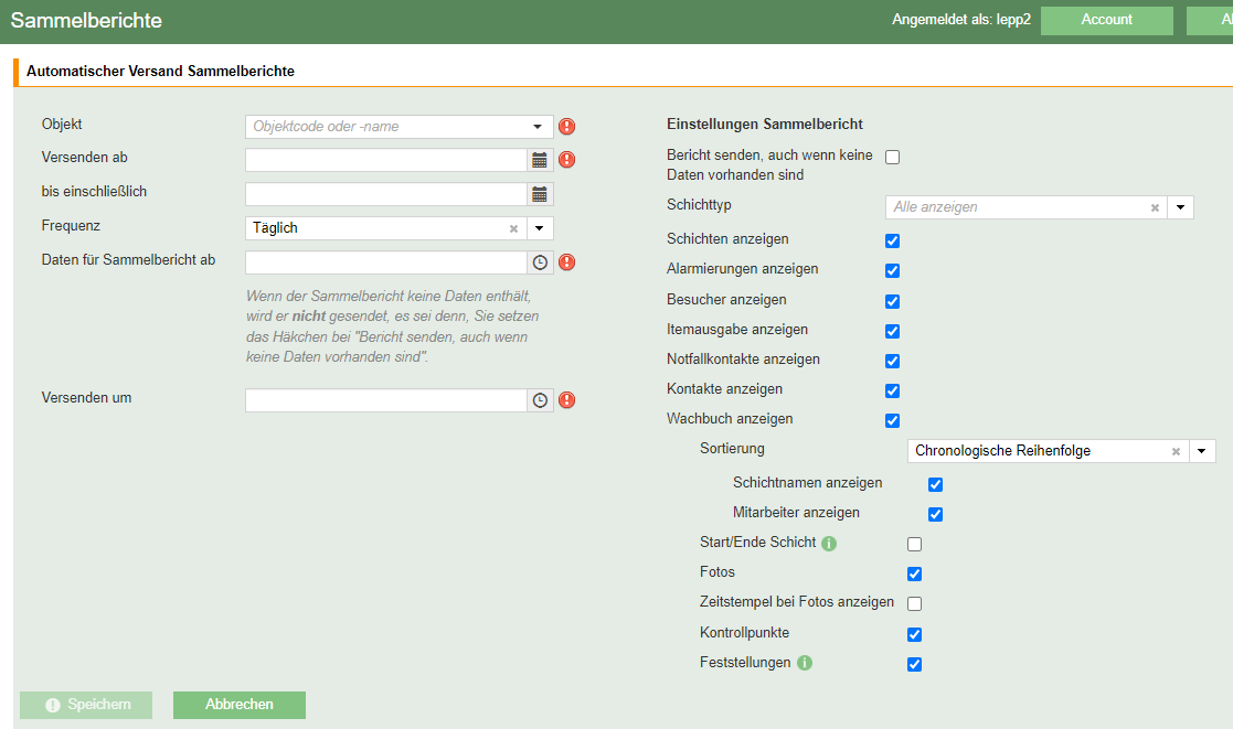 Ab sofort kann SequriX automatisch Sammelberichte verschicken. Ein Sammelbericht ist eine chronologische Auflistung aller Schichten (optional), Aufgaben, Einsätze und Rundgänge mit Kontrollpunkten für ein Objekt. Sammelberichte können täglich, wöchentlich oder monatlich automatisch verschickt werden. Den Moment des Versands können Sie einstellen.