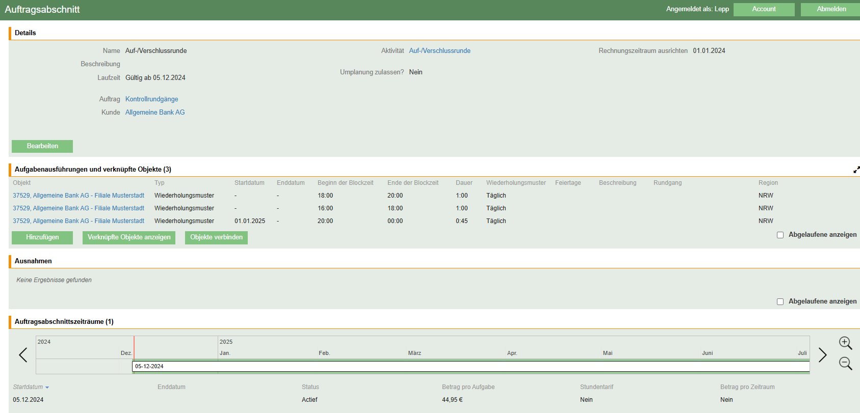 Aufgabenausführungen und verknüpfte Objekte haben in Auftragsabschnitten nun jeweils ihre eigene Laufzeit und hängen nicht mehr unter den Auftragsabschnittzeiträumen. Letztere werden ab jetzt nur noch für die Fakturierung benutzt. Diese Änderung ist darüber hinaus eine Vorbereitung auf die Funktion „automatische Schichttemplates“.