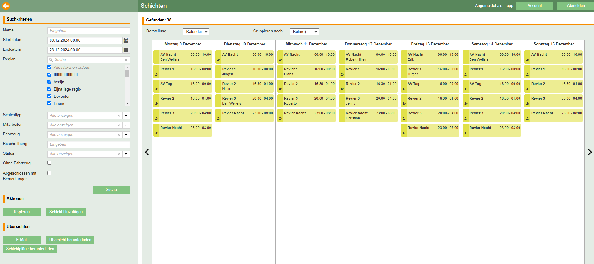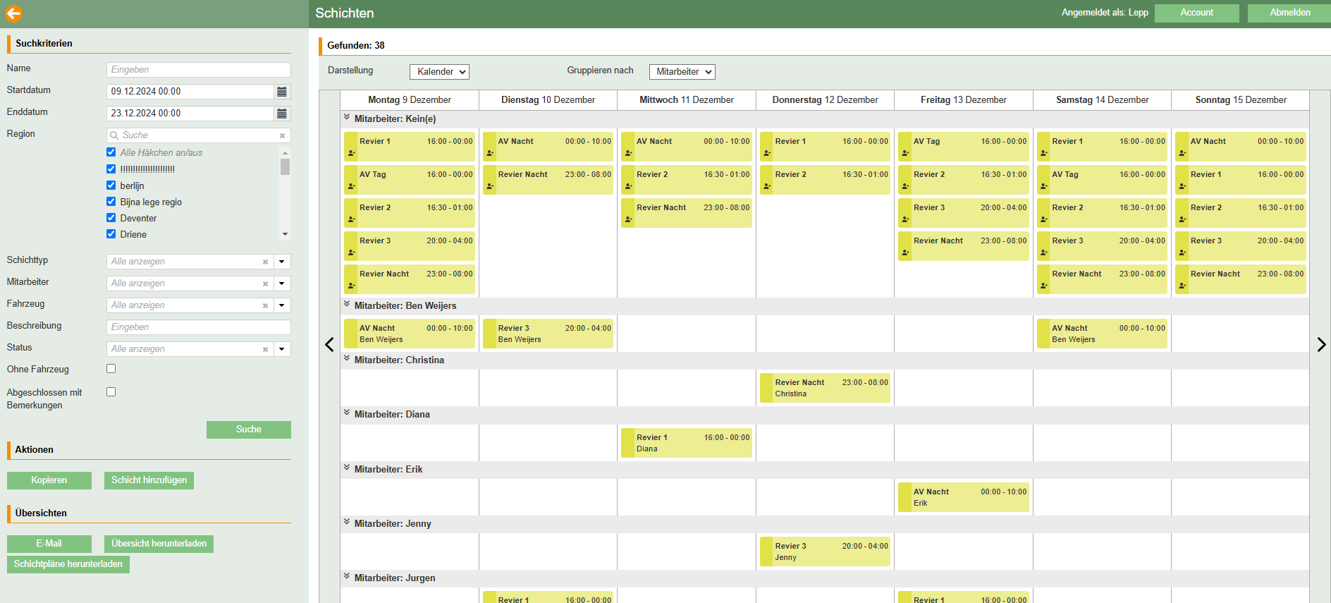 Darüber hinaus ist es möglich, um die Ansicht zu gruppieren nach Schichttyp, Mitarbeiter, Fahrzeug und Status.