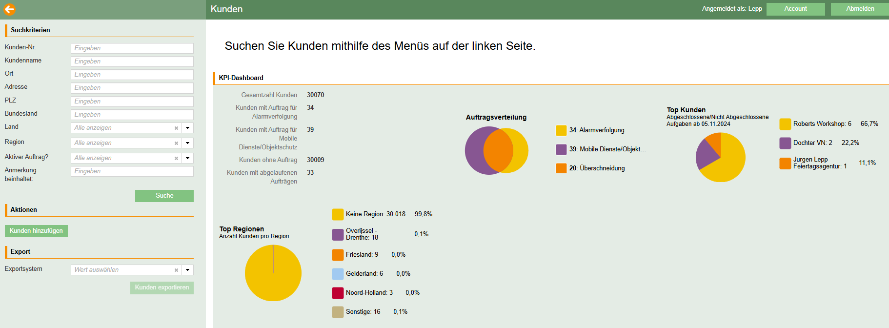 Es wurde ein Dashboard mit Grafiken für Kunden und Aufträge hinzugefügt. Das Dashboard wird geöffnet, wenn Sie oben im Menü auf das Modul „Kunden“ klicken.