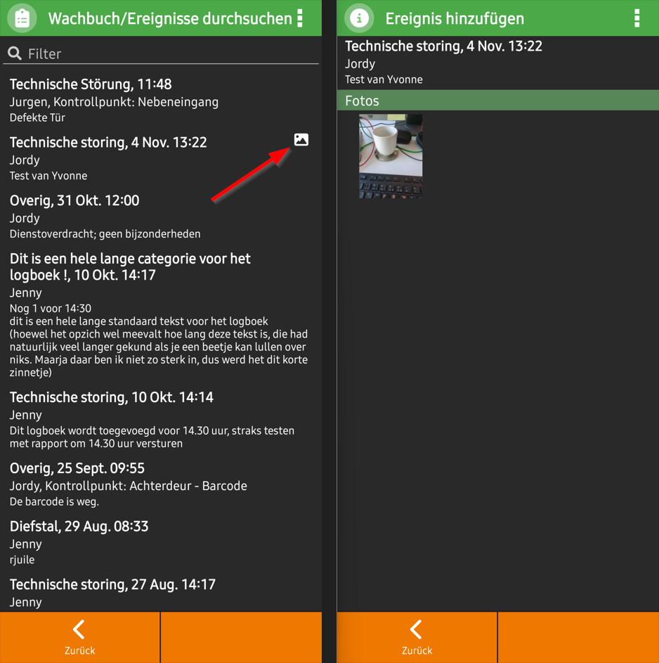 Im Wachbuch ist das Hochladen von Fotos aus der Smartphone Galerie nun möglich. Dafür benötigt der Benutzer das neue Recht "Fotos hochladen erlauben". Darüber hinaus ist es möglich, um in der Aufgabenauswertung im Backoffice bei Wachbucheinträgen nachträglich Fotos vom Computer hochzuladen. Diese Fotos erscheinen im Kundenbericht. Funktioniert nur, solange der Aufgabenbericht noch nicht verschickt wurde. - Fotos in Wachbuch Historie in der App