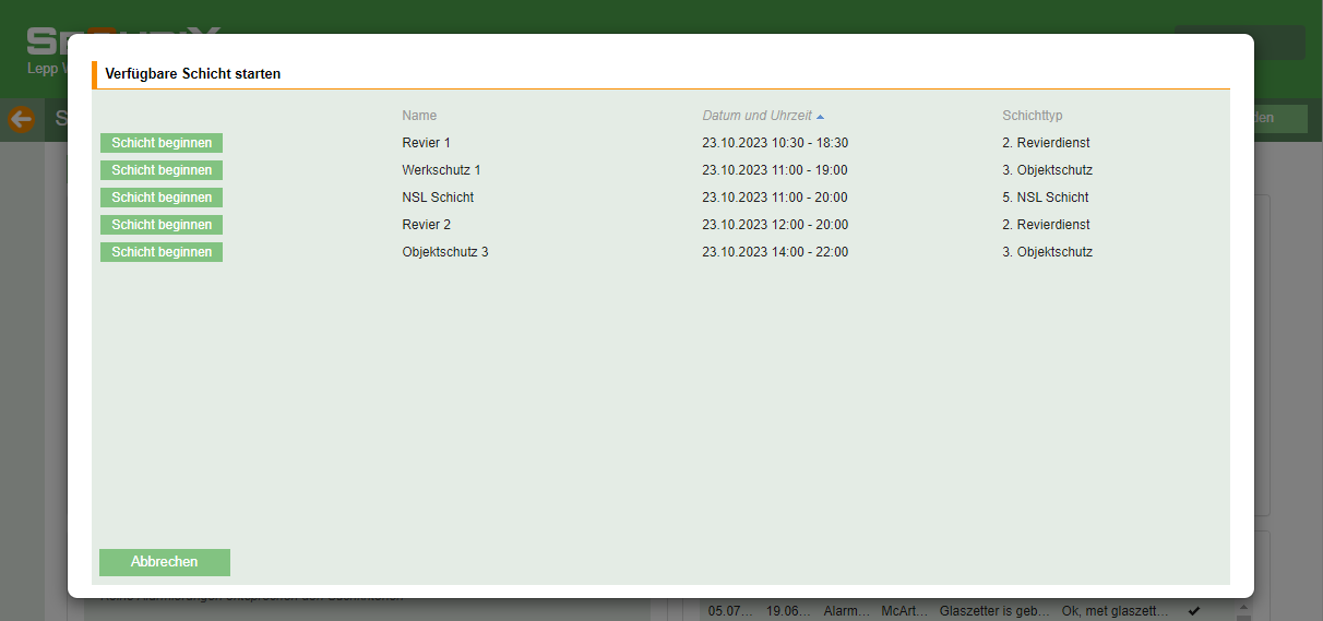 Wenn Sie auf die Schaltfläche "Verfügbare Schicht starten" klicken, öffnet sich ein Popup mit den verfügbaren Schichten: