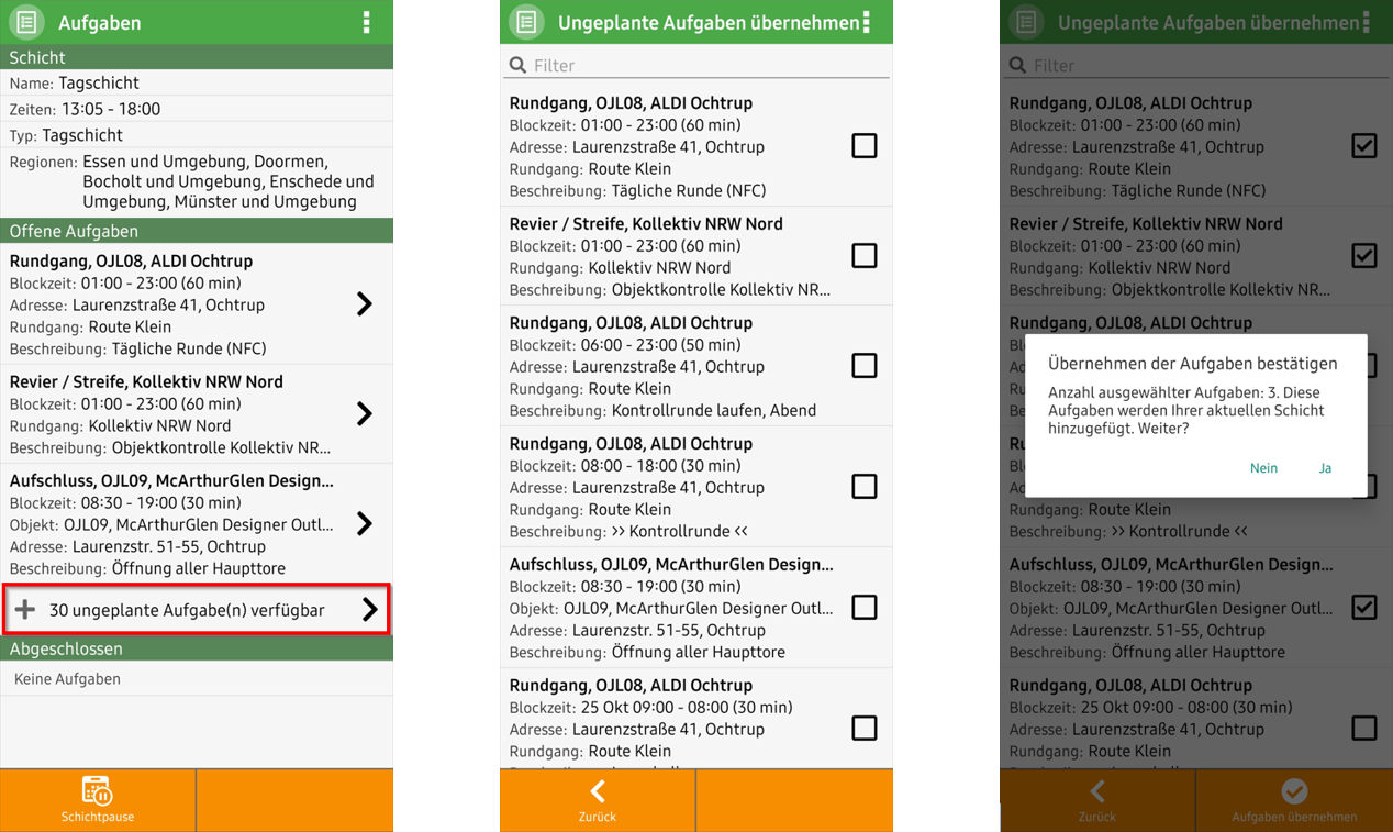 Aufgaben, die keiner Schicht zugewiesen wurden, sind in der App über die Option „X ungeplante Aufgabe(n) verfügbar“ abrufbar und können der eigenen laufenden Schicht zugewiesen werden.